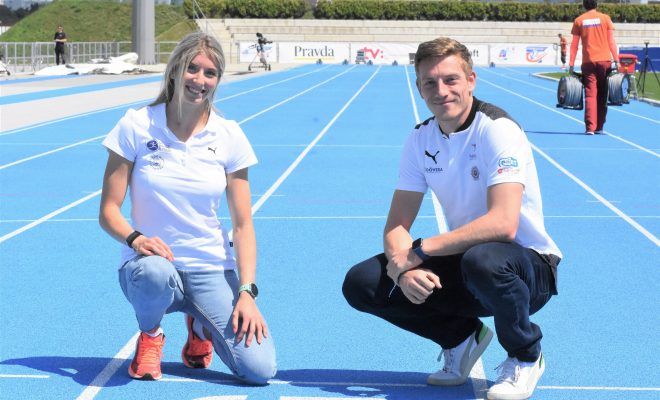 Foto Ján Luky: Emma Zapletalová, členka NŠC a Ján Vpolko na atletickej dráhe v Šamoríne