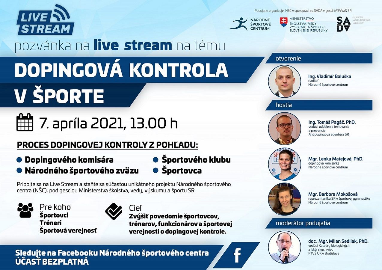 Bratislava 31.3.2021 (NŠC) - Národné športové centrum (NŠC) pod gesciou Ministerstva školstva, vedy, výskumu a športu SR dňa 7.4.2021 o 13.00 hodine zorganizuje druhý Live Stream s názvom Dopingová kontrola v športe.