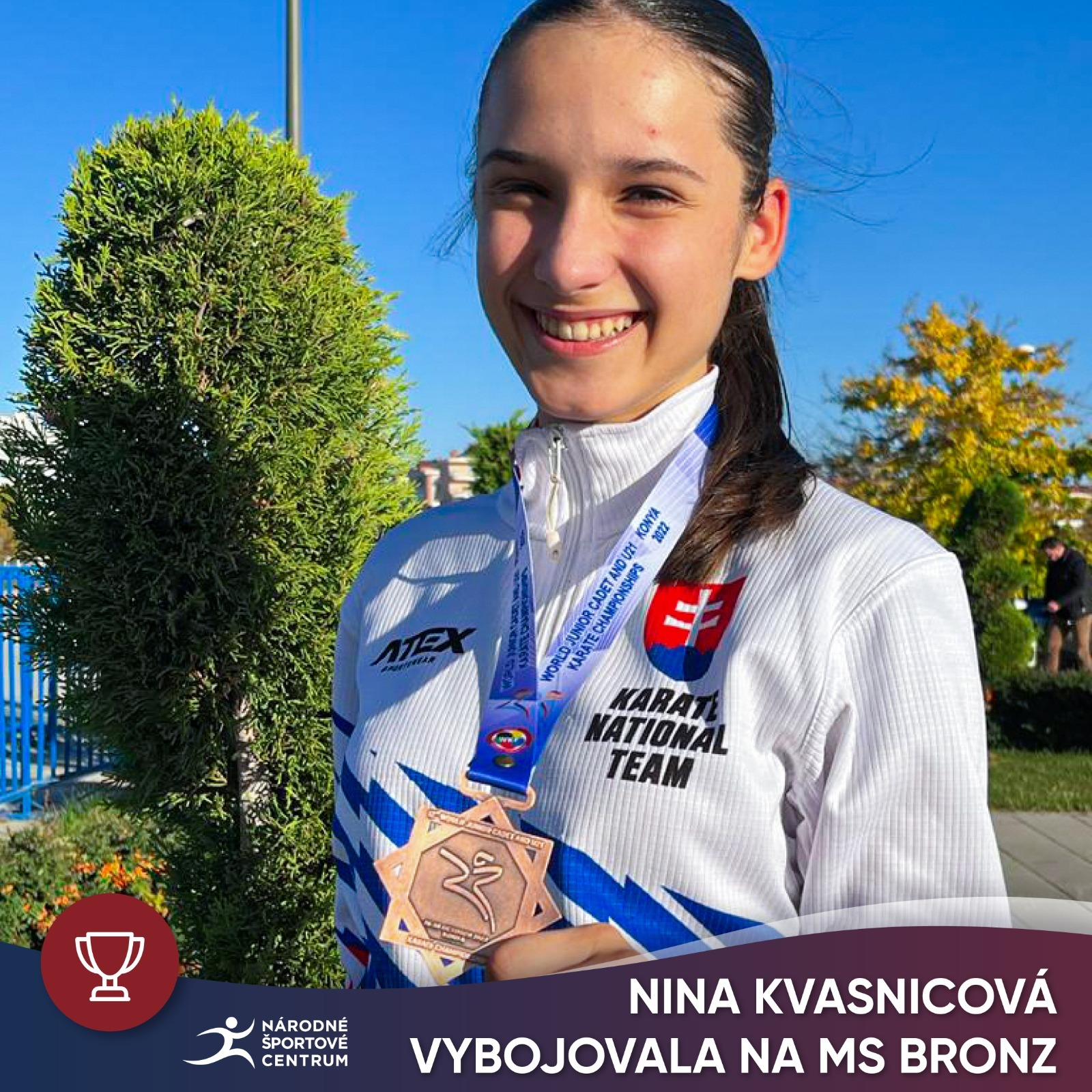 Karatistka Nina Kvasnicová v sobotu na Majstrovstvách sveta kadetov, juniorov a U21 v Turecku vybojovala bronzovú medailu. Zverenkyňa Daniela Kvasnicu súťažila v kategórii Kumite junioriek do 53 kg, v celkovej konkurencii 51 karatistiek z 51 krajín. Na šampionáte sa zúčastnilo 1861 športovcov zo 105 krajín.