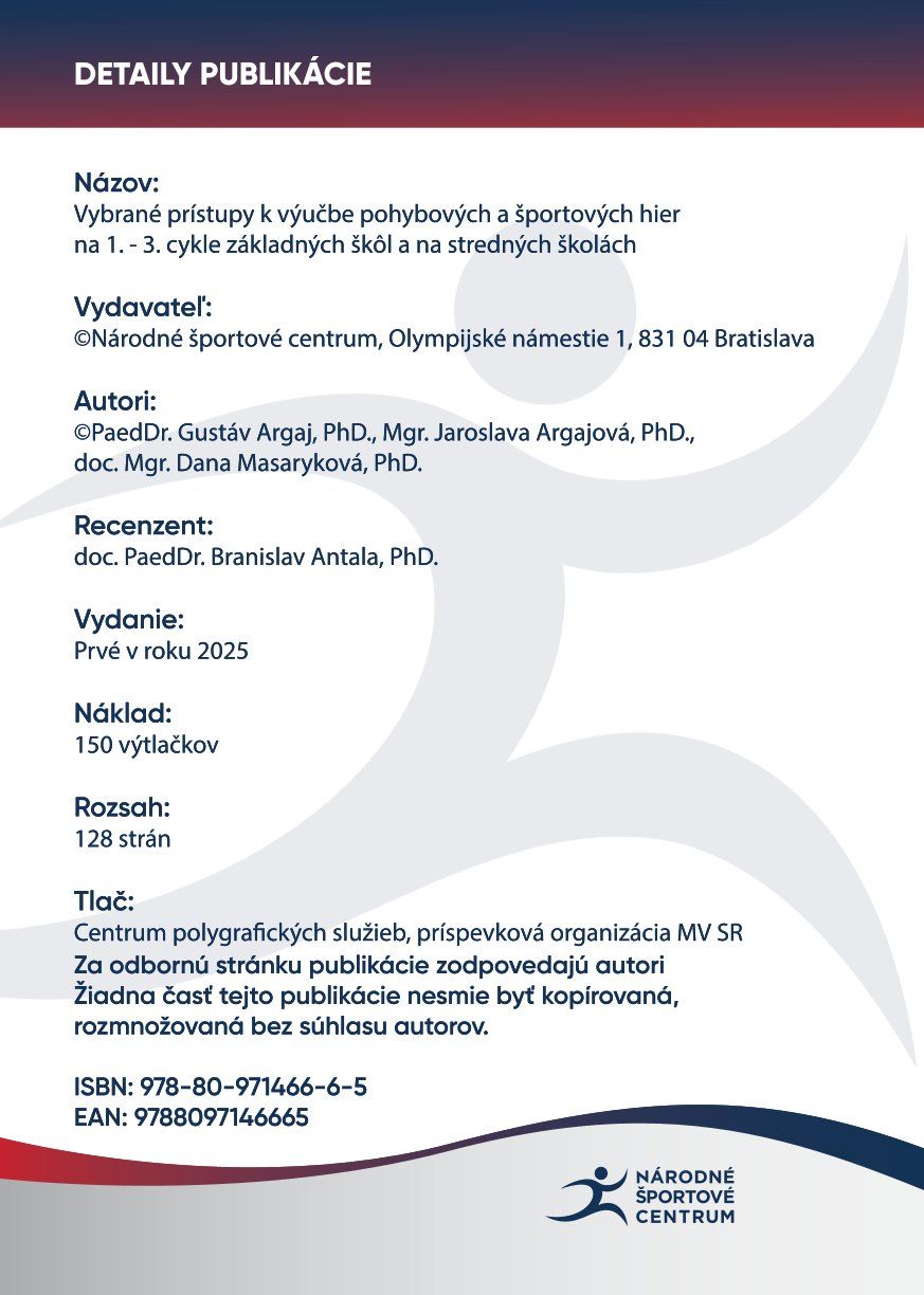 Druhá metodická príručka Národného športového centra k programom inovačného vzdelávania, určená pre učiteľov telesnej a športovej výchovy na základných a stredných školách, vychovávateľov a školských trénerov, ktorí sa priamo zúčastňujú inovačného vzdelávania. Rovnako je určená pre všetkých, ktorí sa pohybujú v oblasti záujmu inovácií vo vyučovacích metódach telesnej a športovej výchovy v škole a v školskom zariadení. Publikácia je obohatená o mnohé príklady pohybových a športových hier pre jednotlivé stupne vzdelávania po kurikulárnej reforme v roku 2025. Ponúka menej využívané prístupy k výučbe rôznych športových hier a inšpiruje k príprave tematických celkov. Výber spracovaných tém v publikácii vychádza z predchádzajúcich skúseností autorov a najčastejších požiadaviek účastníkov vzdelávaní tohto typu.